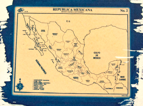 31 Cianotipos de la república Mexicana, cada uno mide 15x10cm. La propuesta genera una reflexión a partir de un mapa de la república mexicana, en relación a una construcción visual de desvanecimiento pensando en los acontecimientos sociales que se suscitan en México día a día.